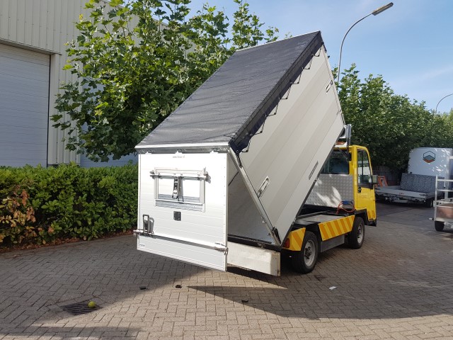 laatste stuk van het dak kan 45graden op d.m.v. gasdrukveren voor het gemakkelijk inblazen van houtsnippers